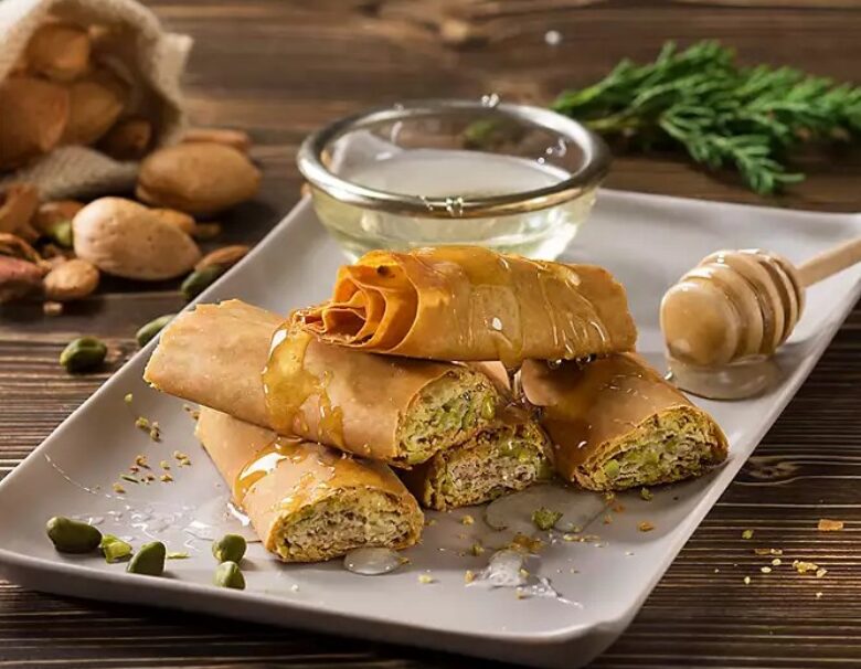 U lončiću rastopi maslac i dodaj ulje. Pećnicu ugrij na 180°C.Jedan komad lisnatog tijesta poprskaj mješavinom ulja i maslaca, poklopi drugim listom i ponovno poprskaj. Ravnomjerno rasporedi bademe i pistacije na tijesto, a zatim smotaj i položi na lim za pečenje obložen masnim papirom. Premaži ostatkom mješavine maslaca i ulja te peci 20-25 minuta u pećnici.