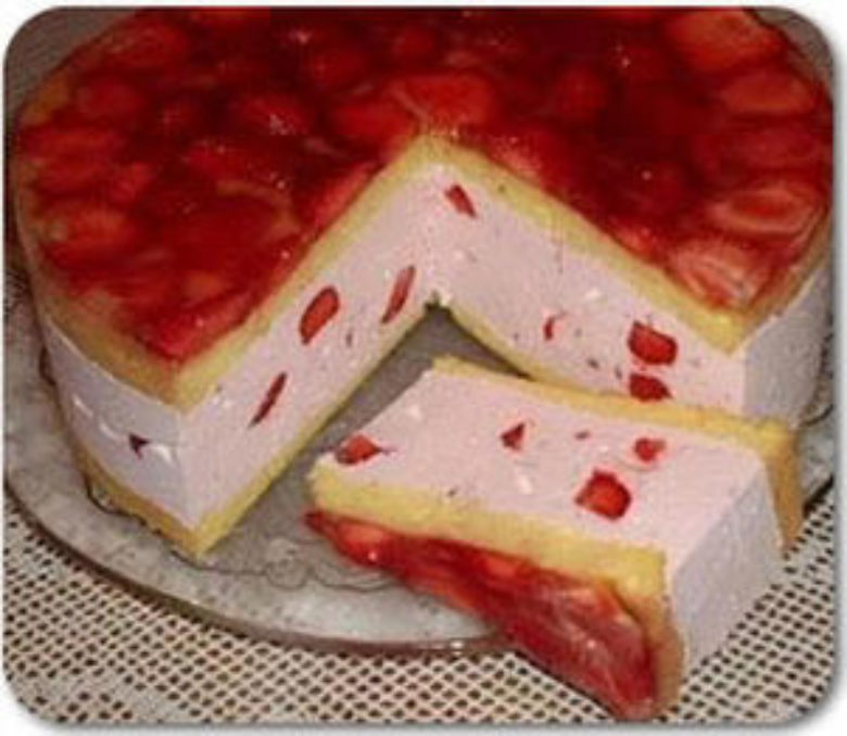 Mutiti žumanjke sa šećerom i žlicom vode, dodati brašno s praškom i na kraju snijeg. Ispeći u okruglom kalupu, ohladiti i prerezati vodoravno. U voćni jogurt dodati šećer i vanilin šećer te promiješati. Izraditi šlag od slatkog vrhnja pa i njega umiješati u jogurt. Nasjeckati jagode (može i breskve iz konzerve, ali onda i jogurt mora biti od bresaka) pa dodati u smjesu. Namočiti želatinu sa 12 žlica vode te staviti na vatru da se otopi(ne smije provrijeti). Otopljenu želatinu odmah polako ulijevati u smjesu šlaga i jogurta lagano miješajući. Složiti na dno kalupa jednu koru, izliti sav fil i pokriti drugom korom. Dobro ohladiti. Na gornju koru složiti narezane jagode i preliti preljevom za torte.