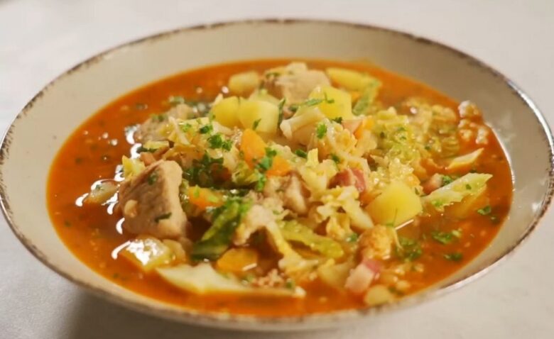 Zagrijemo svinjsku mast u loncu, dodamo slaninu koju kratko popržimo. Dodamo narezani luk, mrkvu i češnjak. Promiješamo i dodamo narezani peršin korijen i celer. Kratko sve presotiramo i dodamo meso. Lagano posolimo i popaprimo i začinimo s cayenneom, kimom i crvenom slatkom paprikom. Dodamo lovorov list. Podlijemo vinom, kratko iskuhamo i prekrijemo vodom. Dodamo kockice krumpira, poklopimo i kuhamo da meso omekša. Za to vrijeme operemo peršin list i sitno ga nasjeckamo. Dodamo narezani kelj i kuhamo još desetak minuta. Dodamo nasjeckani peršin list i ugasimo vatru.