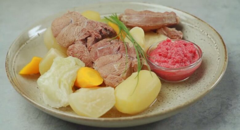 U juhu, nakon pola sata kuhanja, dodamo krumpire, poklopimo i kuhamo dalje. Nakon nekih 45 minuta, dodamo kupus. Kuhamo oko sat i pol sveukupno da meso omekša. Serviramo rustikalno, sve u jedan tanjur. Prelijemo s malo juhe i u zdjelici dodamo jabuka-cikla-hren. Ukrasimo vlascem.