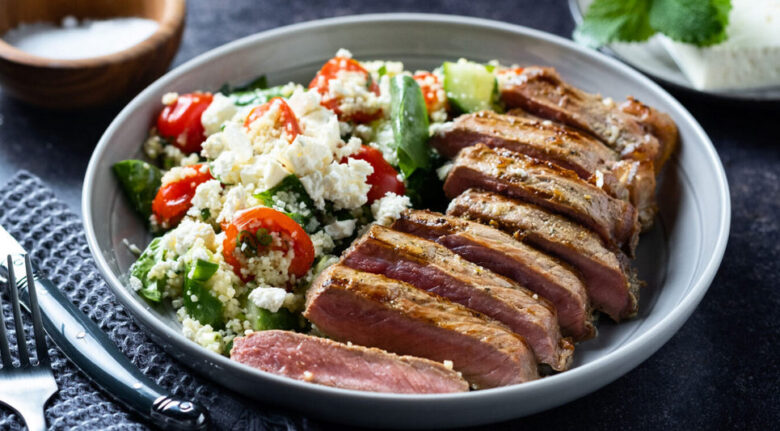 Ramstek pečen na grill tavi i hranjiva salata s povrćem i feta sirom odličan su ručak ili večera za svaki radni dan.