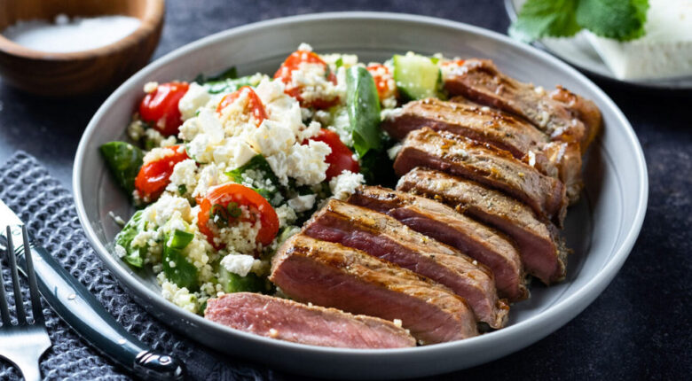 Ramstek pečen na grill tavi i hranjiva salata s povrćem i feta sirom odličan su ručak ili večera za svaki radni dan.
