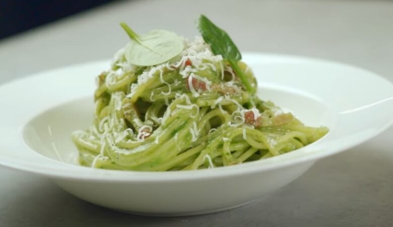Pancetti maknemo kožu i narežemo ju na trakice. Iz tave izvadimo češnjak i na vruće ulje dodamo trakice pancette, da pohrskave. Skroz smanjimo vatru u tavi ili ju ugasimo ako je dovoljno vruća. Na hrskavu pancettu dodamo kuhane špagete i prelijemo zelenom Carbonara smjesom. Promiješamo i dodamo malo škrobne vode od kuhanja pašte, da Carbonara bude sočna. Promiješamo da se sastojci sjedine i serviramo u tanjur. Na gotovu Carbonaru naribamo malo Grana Padano sira i popaprimo.